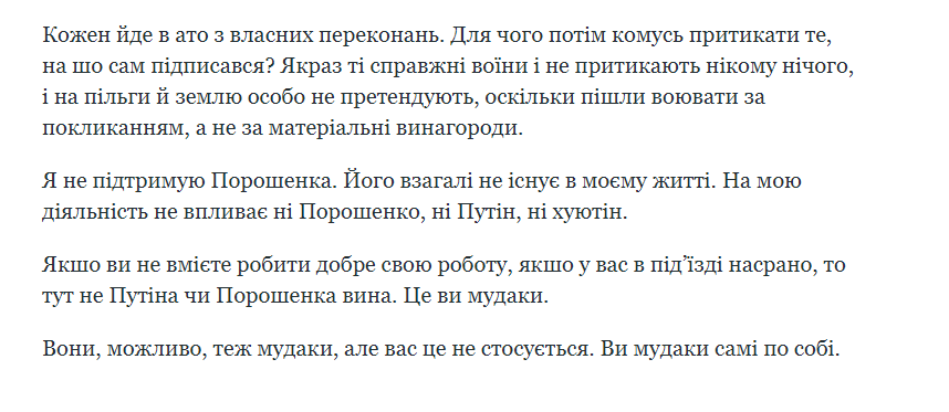 "Каждый идет в АТО из собственных убеждений. Для чего потом кому-то хвастаться тем, на что сам подписался? Настоящие воины как раз и не тыкают никому ничего, и на льготы и землю особо не претендуют, поскольку пошли воевать по призванию, а не за материальные вознаграждения", — пояснил он.