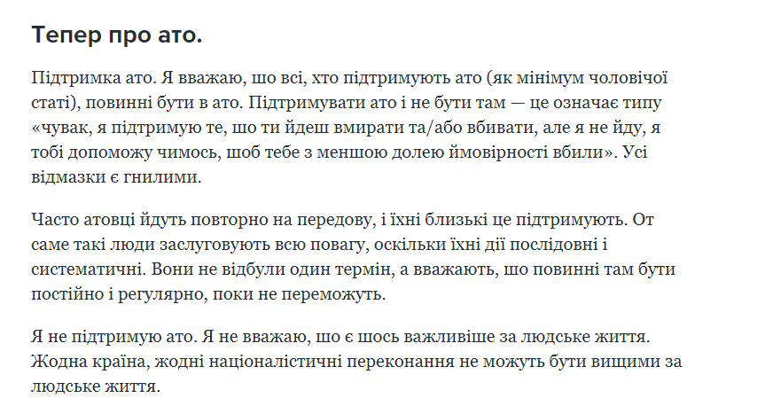 "Я считаю, что все, кто поддерживают АТО (как минимум мужского пола), должны быть в АТО. Поддерживать АТО и не быть там — это значит типа "чувак, я поддерживаю то, что ты идешь умирать и/или убивать, но я не иду, я тебе помогу чем-то, чтобы тебя с меньшей долей вероятности убили". Все отмазки являются гнилыми", — написал Иванец в Livejournal.