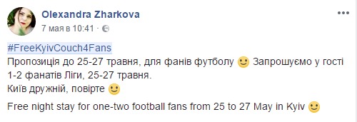 Киевляне стали приглашать к себе гостей лиги чемпионов бесплатно переночевать. Под хештэгом #freekyivcouch4fans они публикуют в социальных сетях свои приглашения для гостей финала Лиги Чемпионов.