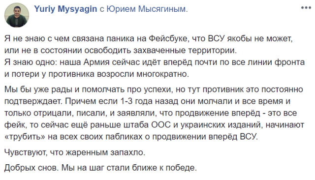Украинский волонтер Юрий Мысягин сообщил о панике боевиков из-за последних событий. Он пишет: «Мы бы уже рады и помолчать про успехи, но тут противник это постоянно подтверждает. Причем если 1−3 года назад они молчали и все время и только отрицали, писали, и заявляли, что продвижение вперед — это все фейк, то сейчас еще раньше штаба ООС и украинских изданий начинают „трубить“ на всех своих пабликах о продвижении вперед ВСУ».