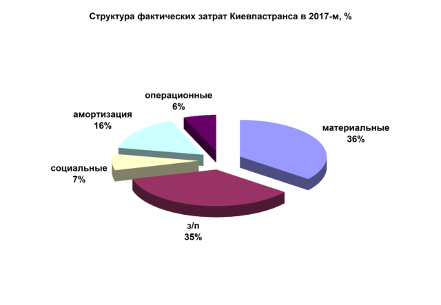 В 2017-м, 35% затрат составила заработная плата (663 млн. грн.), 36% — материальные затраты, в том числе на покупку энергоносителей (655 млн. грн.), 7% — социальные (133 млн. грн.), 16% амортизация (297 млн. грн.), 6% — операционные (112 млн. грн.). Таким образом, доходов от перевозки платных пассажиров (570 млн. грн.) почти хватает на выплату заработной платы персоналу, а вот для закупки топлива и ремонта уже нужны государственные дотации.