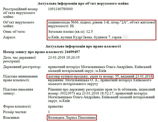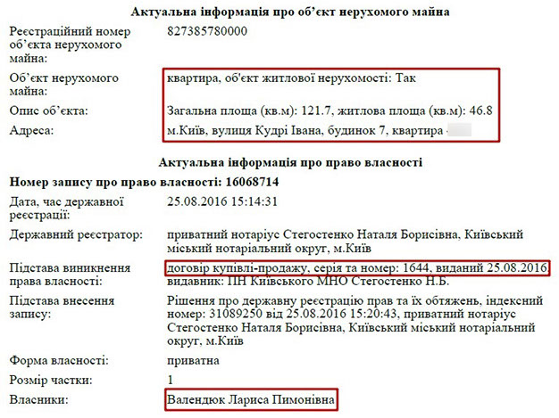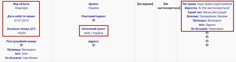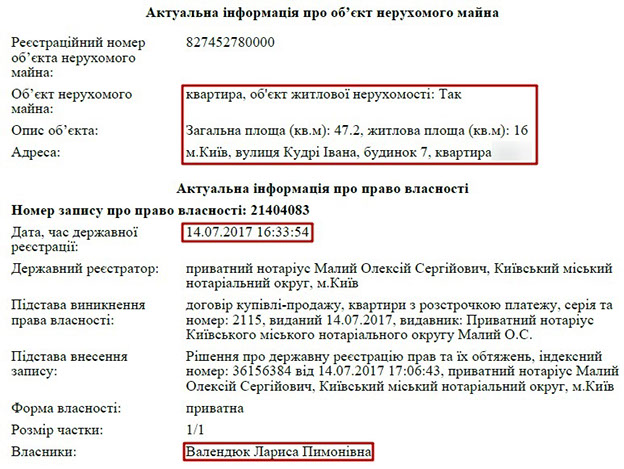 Натомість у Реєстрі згадується інша нерухомість матері. Лариса Пимонівна Валендюк є власницею двох столичних квартир площею 168 кв. м. та паркомісця за адресою: вул. Івана Кудрі, 7. Це елітний житловий комплекс ЖК Central Park, де ціни подібних квартир – 2,3 та 8,1 млн грн відповідно.