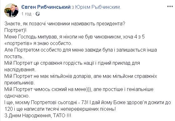 «Но Портретом лично для меня всегда была и остается другая фигура. Мой Портрет это настоящая гордость нации и достойный пример для подражания. Мой Портрет не имеет миллионов долларов, но имеет миллионы настоящих поклонников. Мой Портрет чем-то похож на меня))), но проще и гениальнее одновременно», — отметил Рыбчинский.