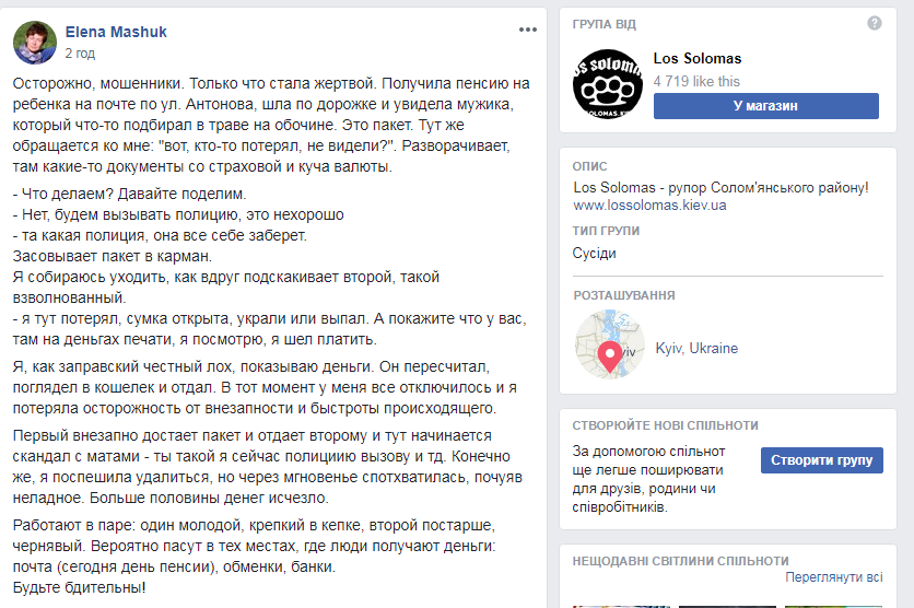 О преступной схеме рассказала женщина, которая сама стала жертвой мошенничества. Злоумышленники подстерегали ее возле почты, где она получила пенсию на ребенка, написала потерпевшая Елена Машук в группе Los Solomas в Facebook.