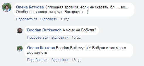 "Сплошная эротика... Особенно волосатая грудь Вакарчука....", "Мачо", "Славодимир Бобуленчук", - отметили пользователи.