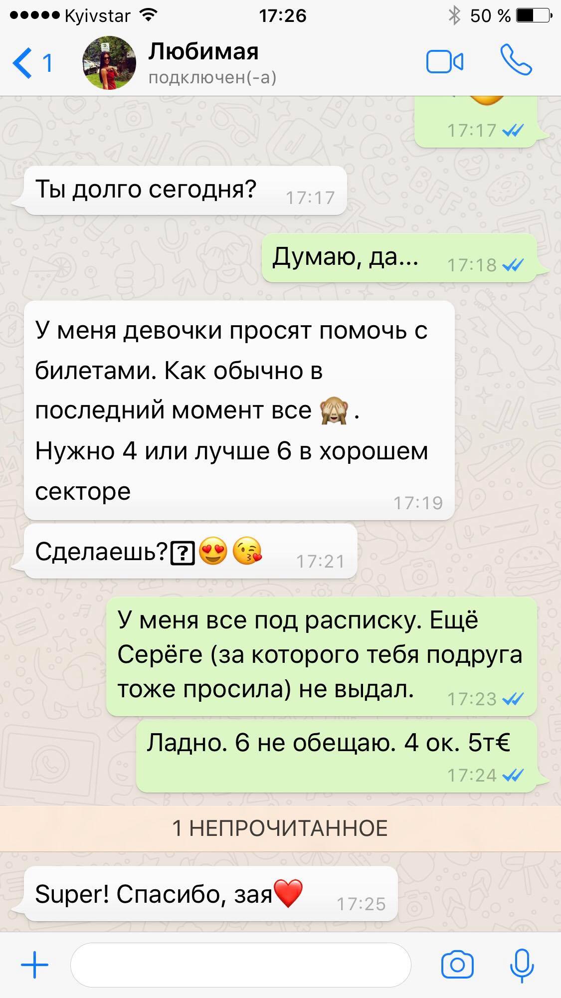 Так, Катя уже как минимум дважды просила Павелка «достать» билеты: «для Сергея, за которого просила подруга» и еще 4 или 6 «для девочек».