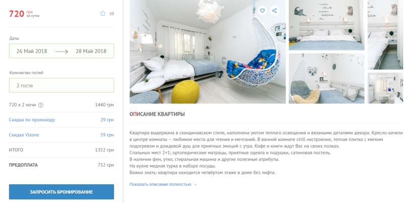 Бронирование работает точно также как и у зарубежных аналогов. Выбираете даты в календаре, отправляете запрос. Если владелец его одобрил — бронируете.