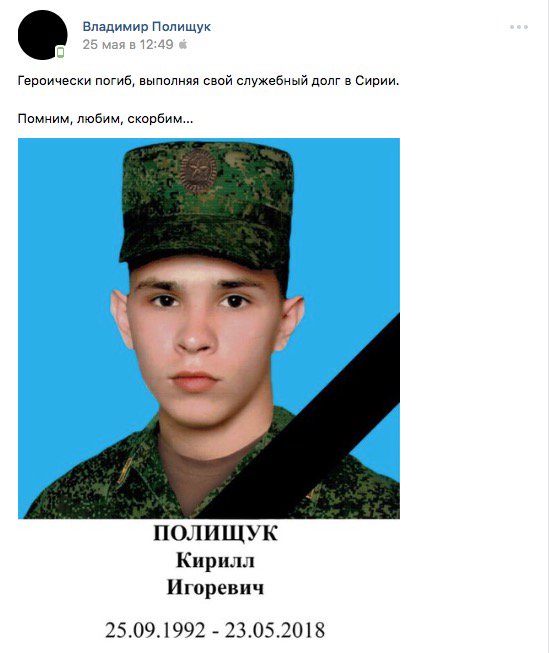 Кроме того, появились сообщения о гибели в Сирии 25-летнего российского военнослужащего Кирилла Полищука, который также погиб 23 мая. Имеет ли его гибель отношение к инциденту с обстрелом бойцов 200-й бригады, неизвестно.