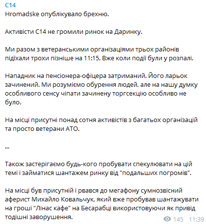 "Активисты С14 НЕ громили рынок. Мы вместе с ветеранскими организациями трех районов подъехали чуть позже, на 11:15. Уже когда события были в разгаре… На месте присутствуют более сотни активистов из многих организаций и просто ветераны АТО", - написано в сообщении.