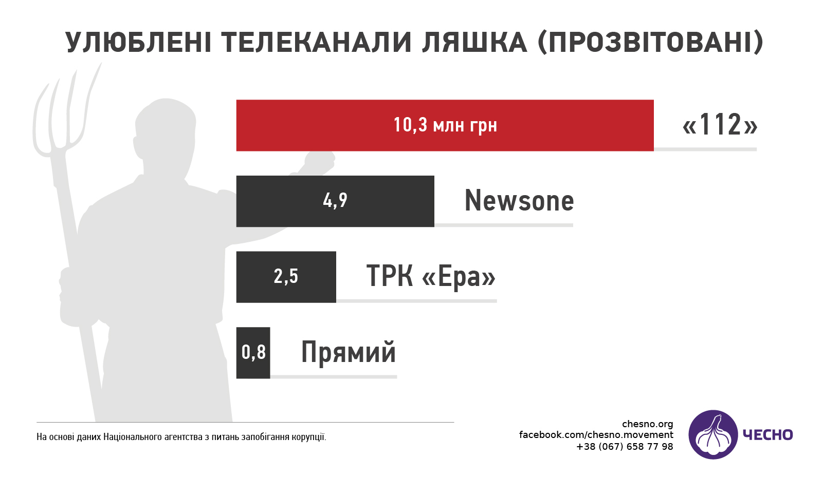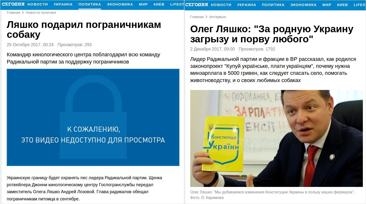 Додає гостроти ситуації і той факт, що ці ж матеріали з’являються в новинному блоці і на телеканалі "Україна", який у фінансових звітах "Радикальної партії" взагалі не фігурує. Згідно з даними "Детектору медіа", наданими Громадському руху ЧЕСНО, Олег Ляшкопротягом 2016-2017 років понад 120 разів з’являвся лише в новинній програмі "Сегодня".