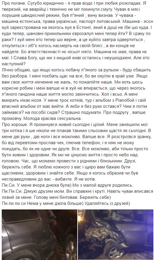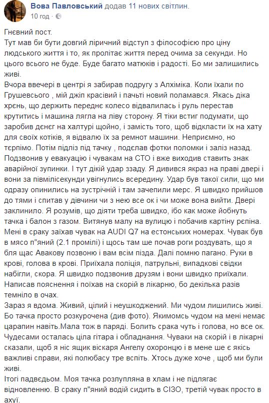 "Сейчас я дома. Живой, цел и невредим. Мы чудом остались живы. Потому тачка просто раскурочена. Каким-то чудом на мне нет даже царапины. Малая тоже в порядке. Болит жопа чуть и голова, но все ок. Чудесами осталась целая гитара и оборудования. Чуваки на скорой и в больнице сказали, чтобы я нес ящик вискаря Ангелу-хранителю и у меня еще есть какие-то важные дела, которые по-любасу надо успеть. Кто-то очень хочет, чтобы мы были живы", - написал Павловский.