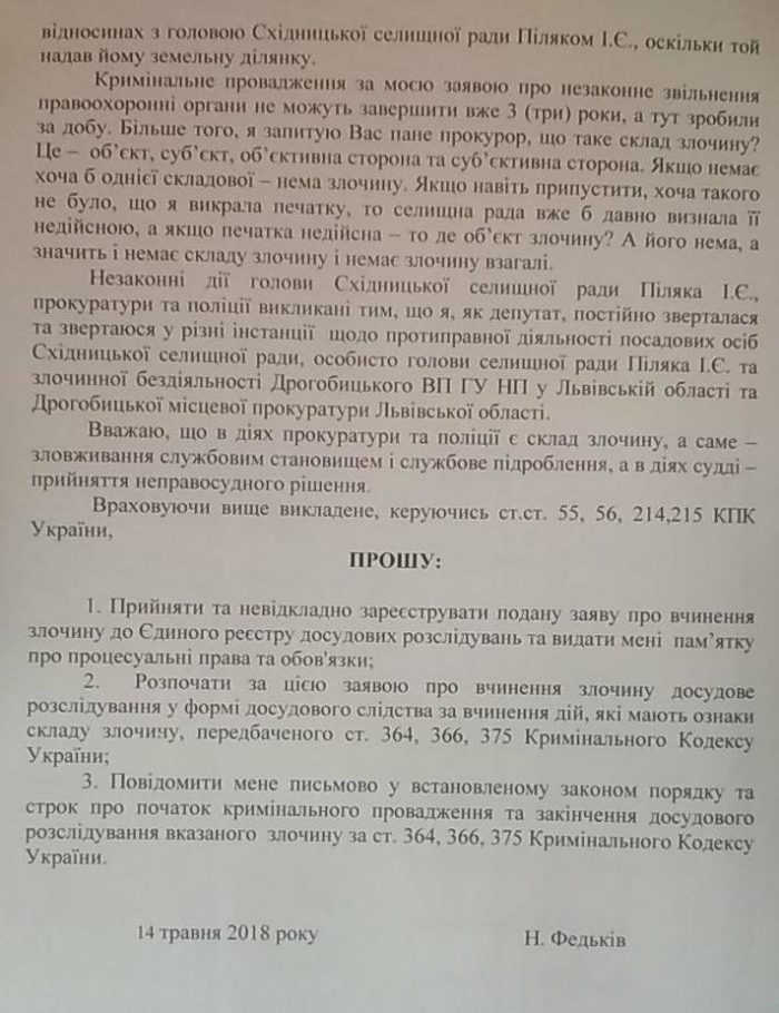 Відчуваючи повну безкарність, посадовець відкрито плює на Конституцію України та Закони України", - заявив Резонансу активіст.  - Майже за 8 років своєї діяльності на посаді селищного голови І. Піляк не надав жодної відповіді на інформаційні запити громадян та громадських організацій. Ігноруються навіть депутатські звернення місцевих обранців. Аби вплинути на сільського голову трьом депутатам Н. Федьків, К. Пелюх та Р. Бобешко довелося звертатися до суду. Бориславський міський суд Львівщини встановив факт перешкоджання законній депутатській діяльності з боку голови селищної ради Івана Піляка. "Але незважаючи на очевидні факти слідчі Самбірського ВП ГУ НП у Львівській області незаконно закрили дане кримінальне провадження, а прокуратура області погодила цю постанову".