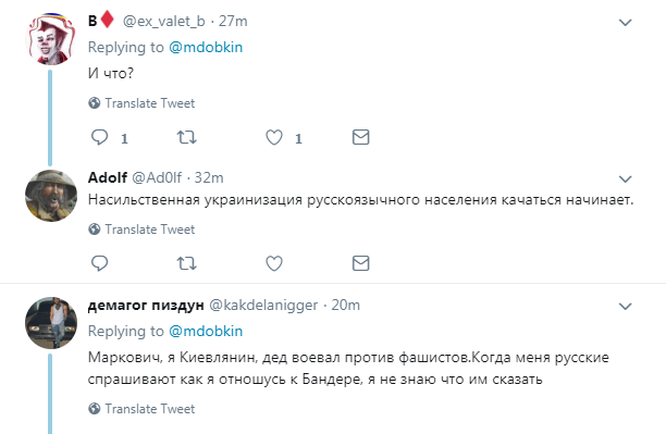 "Филижанка. Мешты. Коцик. Гарбата. Жевжик. Это не ругательные слова. Это украинский язык от "не рабов", - написал Добкин.