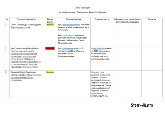 Громадські активісти з організації State Watch довільно проаналізували 30 кандидатів, серед яких виявили люстрованих чиновників, а також тих, хто фігурував/фігурує у кримінальних, адміністративних чи дисциплінарних провадженнях. «Наші інтерни довільно обрали 30 кандидатів на керівні посади у ДБР. Здається вони добирали зі списку знайомі прізвища, які неодноразово звучали у пресі», - так пояснив «Главкому» принцип вибірки представник State Watch Володимир Петраковський