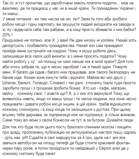 «Не дам никому ни копейки. Пусть хоть депортируют и лишат гражданства. Пусть хоть сам президент придет меня встречать на границе. Почему я должен работать где-то, оставив всех своих чтобы выжить, а с меня просят налоги? Почему найти работу в ср*ной Польше или Чехии легче чем в моей стране?», — отметил заробитчанин.