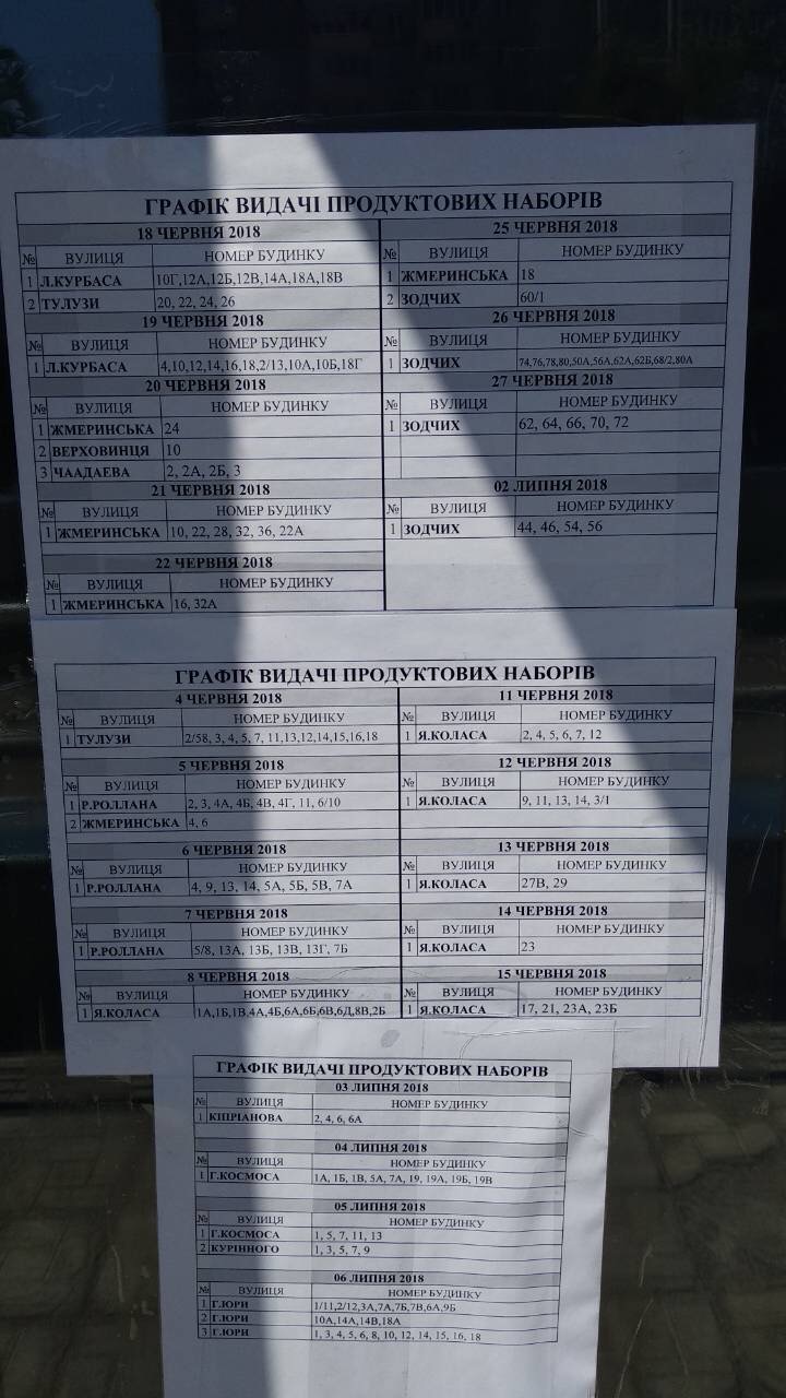 Кроме того, местному жителю удалось сфотографировать объявление с графиком выдачи продуктовых наборов от Товмасяна, где указаны дни, когда будет раздаваться “предвыборная гречка” (с 4 июня по 6 июля), а также адреса выдачи.