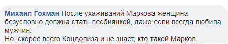"После ухаживаний Маркова женщина безусловно должна стать лесбиянкой, даже если всегда любила мужчин. Но, скорее всего Кондолиза и не знает, кто такой Марков", – отметили в сети.
