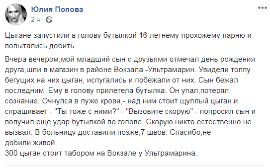 "Младший сын с друзьями отмечал день рождения друга. Шли в магазин в районе вокзала, возле "Ультрамарина". Увидели толпу бегущих на них ромов, испугались и побежали. Сын бежал последним. Ему в голову прилетела бутылка. Он упал, потерял сознание", - написала женщина.