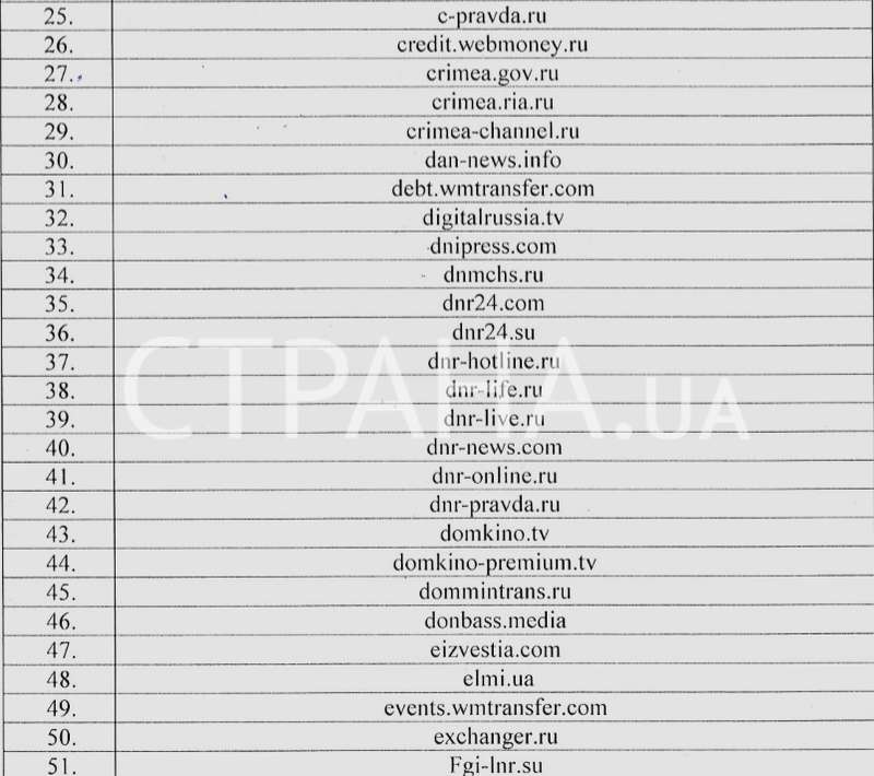В документе присутствуют сайты «ДНР» и «ЛНР», официальные веб-странички крымских властей, многие российские информационные агентства, а также все поддомены платежного сервиса Webmoney.