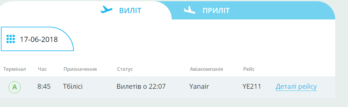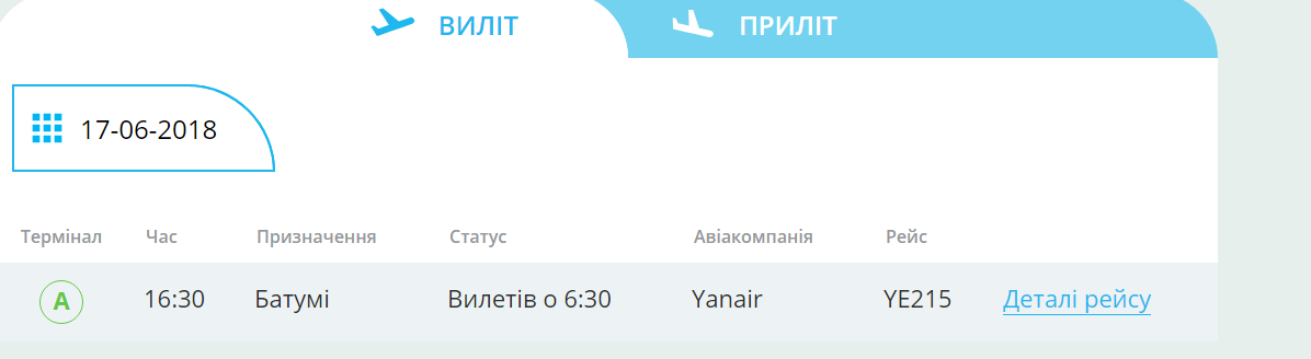 Сегодня, 18 июня, самолет до Батуми должен был вылететь в 8:45 утра, но его отложили до 13:00, сообщается в расписании рейсов на официальном сайте аэропорта "Киев".
