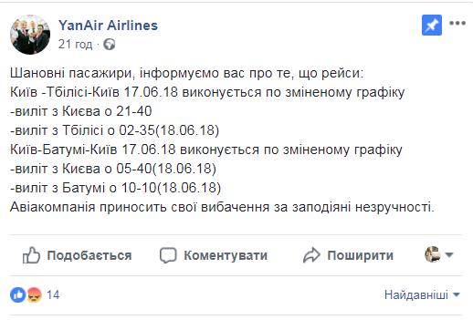 На странице авиалиний YanAir в Facebook информацию об изменении расписания на 17 июня сообщили в посте, однако официальную причину не назвали. Кроме того, и после этого опубликованного расписания оба рейса перенесли еще раз.