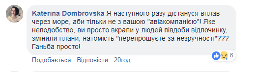 "Я в следующий раз отправлюсь вплавь через море, лишь бы не вашей авиакомпанией. Какое неподобство, вы просто украли у людей половину суток, изменили планы, а вместо этого "извиняетесь за неудобства"? Позор просто", ― высказалась в комментарии к записи Екатерина Домбровская.