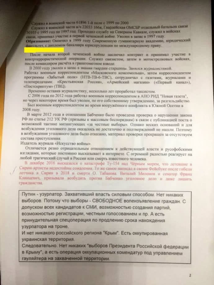 Также в распечатке есть часть одного из постов Бабченко в Livejournal о том, что Путин узурпатор, захвативший власть силовым способом.