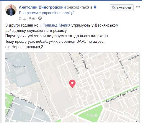 "С двух часов ночи Роланд Мелия содержится в Деснянском райотделе окупационного режима.