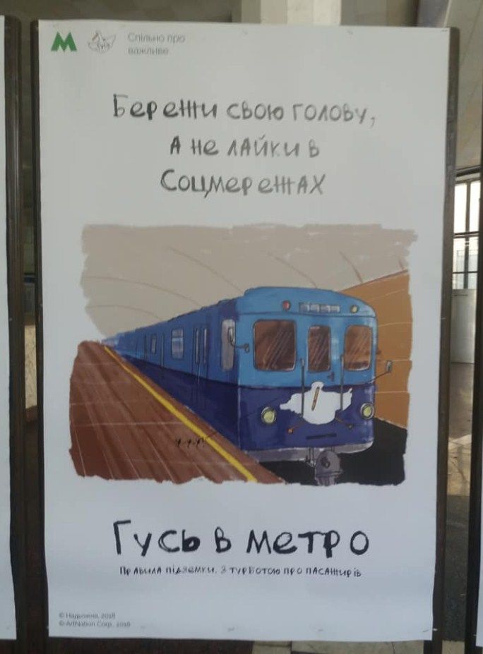 Первые несколько 9 постеров серии "Гусь в метро" разместили 20 июня,на станции метро "Золотые ворота". Об этом сообщает сайт киевского метрополитена, а фотографии постеров публикуют в Facebook пользователи соцсетей.