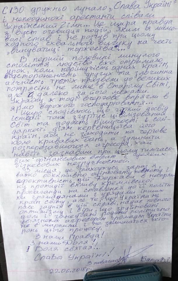 Украинский политзаключенный Владимир Балух, содержащегося в оккупированном Крыму, написал письмо президенту Петру Порошенко