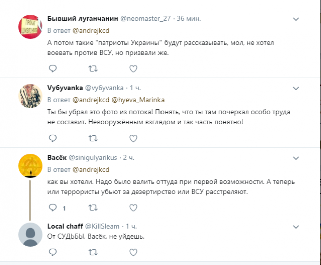 «Как вы хотели. Надо было валить оттуда при первой возможности. А теперь или террористы убьют за дезертирство или ВСУ расстреляют».