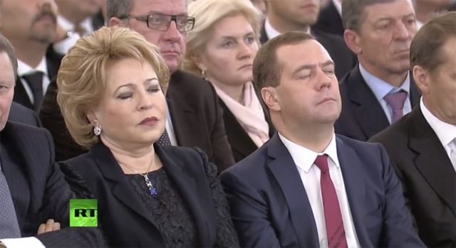 Впервые спящего Медведева «поймали» на открытии Зимних олимпийских игр в Сочи. Также председатель правительства РФ и глава Совета Федерации Валентина Матвиенко вздремнули во время обращения Владимира Путина к парламенту 1 декабря 2016 года.