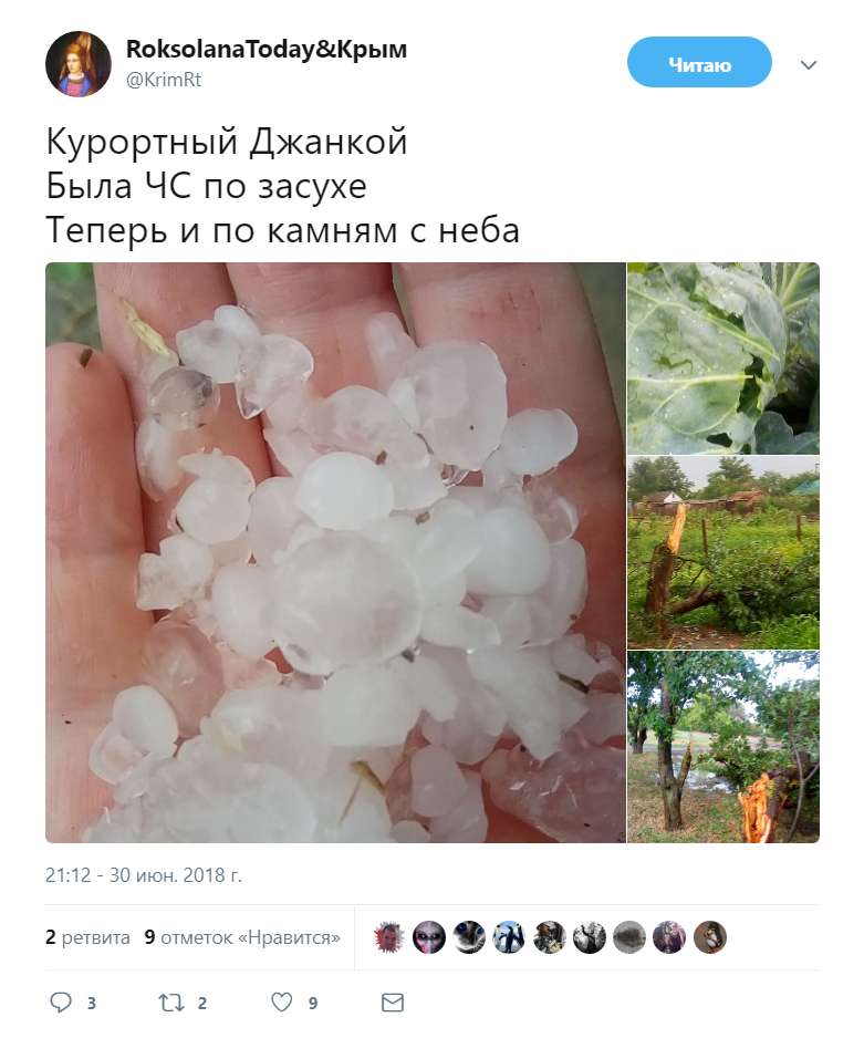 В оккупированном Российской Федерацией Крыму прошел сильный дождь с градом, который уничтожил значительную часть урожая.
