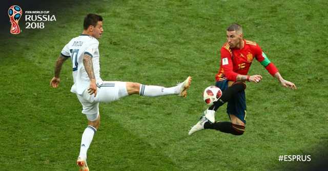 Уже на 11 минуте «красной фурии» удалось отличиться. После подачи с правого фланга в исполнении Иско возрастной Сергей Игнашевич срезал мяч в собственные ворота, став самым возрастным автором автогола в истории чемпионатов мира. После этого испанцы продолжили много владеть мячом, но каких-то дивидендов из этого не имели. А уже в концовке первого тайма еще и пропустили. Жерар Пикенебрежно сыграл рукой в собственной штрафной, и судья указал на одиннадцатиметровую отметку. Пенальти точно исполнил Артем Дзюба — 1:1.