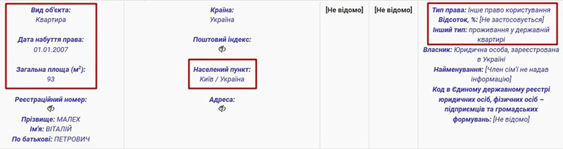 Также Виталий Малех имеет право на пользование государственной квартирой своего родственника в Киеве. Правда, кто является этим родственником — он не указал.