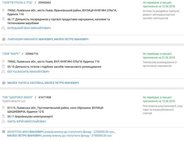 Как уже отмечали, супруги Петр и Лариса Малех занималось бизнесом, благодаря аналитической системе YouControl мы узнали, что они являются совладельцами и акционерами ряда компаний: ТЗОВ «ПЕТРОЛЬ-2 ЛТД», ТЗОВ «МАРС», ТОВ «ЗДОРОВ’Я ЗЕМЛІ», ПHАТ "ФІРМА"ЛЬВІВ-ПЕТРОЛЬ«, СП «ЛЬВІВ-ПЕТРОЛІУМ, ТЗОВ», ПАТ «ОКСІ БАНК», ТОВ ІК «СОБУНІКО ГРУП», ТЗОВ «РЕКОНСТРУКЦІЯ». Лариса Евсеевна зарегистрирована как СПД и еще значится среди соучредителей ПП «ПЕЛЕВІТ», ТЗОВ «ЯНГОЛ» и ПРАТ «ТУРИСТИЧНА ФІРМА «ЛЬВІВ-СУПУТНИК».