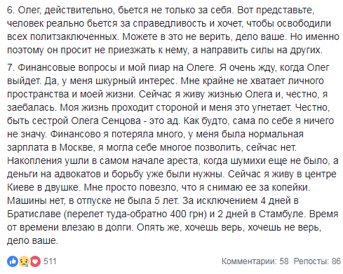 "Финансовые вопросы и мой пиар на Олеге. Я очень жду, когда Олег выйдет. Да, у меня шкурный интерес. Мне крайне не хватает личного пространства и моей жизни. Сейчас я живу жизнью Олега и, честно, я за*балась. Моя жизнь проходит стороной и меня это угнетает. Честно, быть сестрой Олега Сенцова - это ад. Как будто, сама по себе я ничего не значу. Финансово я потеряла много, у меня была нормальная зарплата в Москве, я могла себе многое позволить, сейчас нет. Накопления ушли в самом начале ареста, когда шумихи еще не было, а деньги на адвокатов и борьбу уже были нужны. Сейчас я живу в центре Киеве в двушке. Мне просто повезло, что я снимаю ее за копейки. Машины нет, в отпуске не была 5 лет. За исключением 4 дней в Братиславе (перелет туда-обратно 400 грн) и 2 дней в Стамбуле. Время от времени влезаю в долги. Опять же, хочешь верь, хочешь не верь, дело ваше", - заявила Каплан.