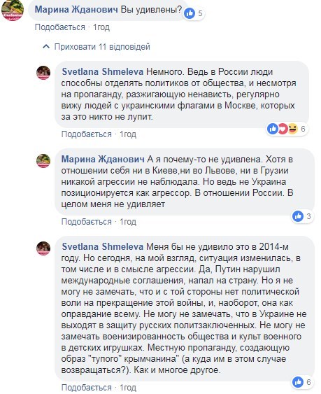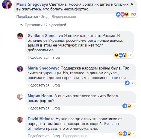 "Странный пост. Разве можно было ждать чего-то другого в стране, где из-за действий России гибнут люди?" - ткнула Шмелеву носом Ирина Мальцева.