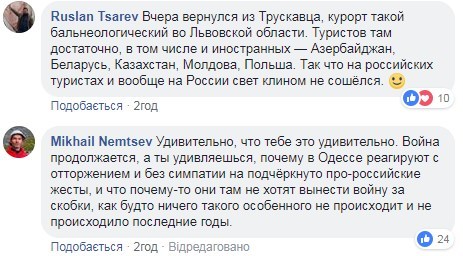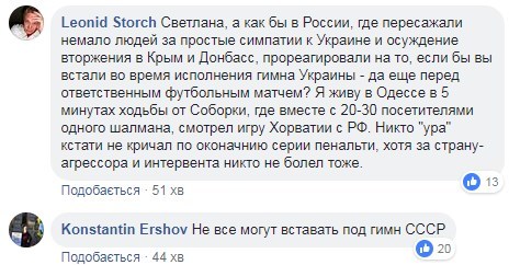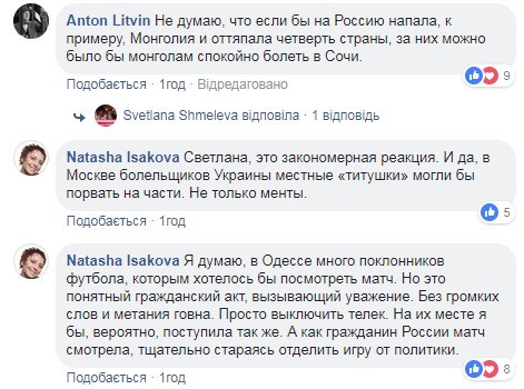 "Я думаю, в Одессе много поклонников футбола, которым хотелось бы посмотреть матч. Но это понятный гражданский акт, вызывающий уважение. Без громких слов и метания говна. Просто выключить телек. На их месте я бы, вероятно, поступила так же. А как гражданин России матч смотрела, тщательно стараясь отделить игру от политики", - написала Наташа Исакова.