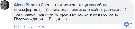 "Эта война, дорогая Светлана. Не забывайте, что в "свободной" Москве или где-то рядом скоро вот-вот умрет заключенный Сенцов. Ничему удивляться нельзя. Но нужно соблюдать единство стиля: если вы едете в Украину, не надо вставать под российский гимн. А если хочется вставать под этот гимн, то лучше не ездить туда, где он теперь надолго ассоциирован с образом врага", - написал Василий Жарков.