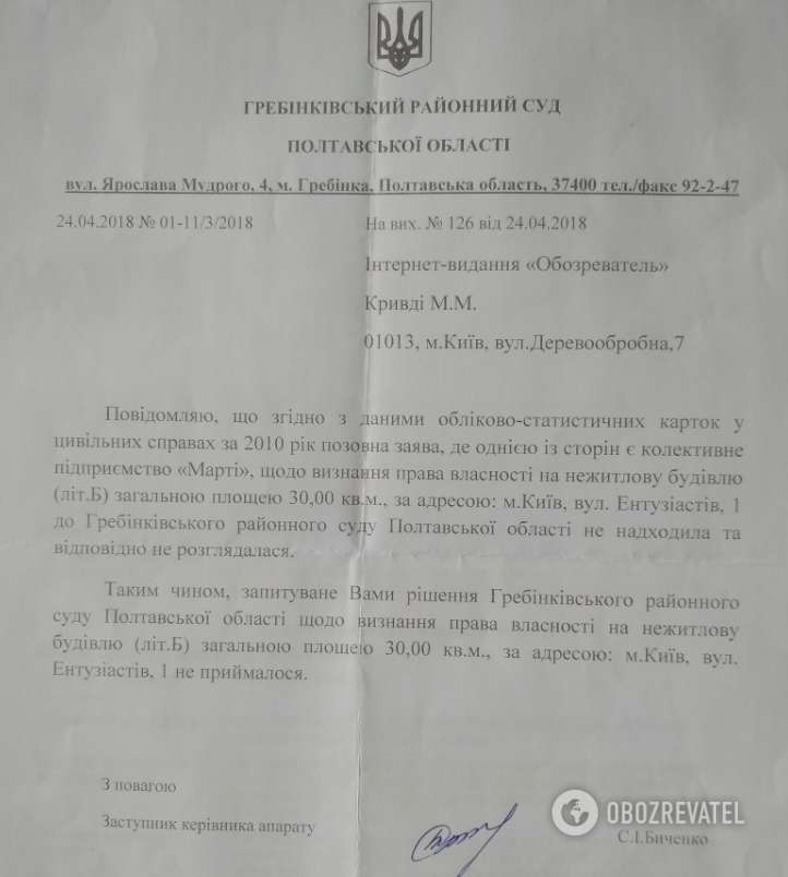 "Таким образом, запрашиваемое вами решение Гребенковского районного суда Полтавской области по поводу признания права собственности на нежилое здание площадью 30 кв. м. по ул. Энтузиастов, 1-б – не принималось", - значилось в ответе.