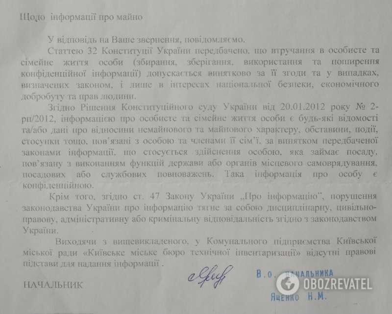 "Исходя из вышеизложенного у коммунального предприятия Киевсовета "Киевское городское бюро технической инвентаризации" отсутствуют правовые основания на предоставление информации", - завершили свой ответ в структуре (детальнее в скриншоте ниже).