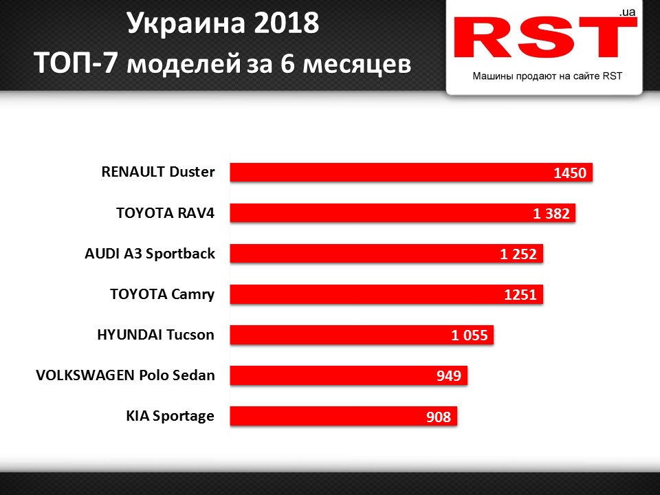 Самой популярной маркой в Украине с начала года сейчас является Toyota. Автомобилей этого бренда зарегистрировали почти 5 тысяч, а сумма покупок составила 200 миллионов долларов. Также в первом полугодии часто покупали Renault и Volkswagen. Среди моделей бестселлером стал кроссовер Renault Duster. За 6 месяцев в Украине зарегистрировали 1 450 таких авто.
