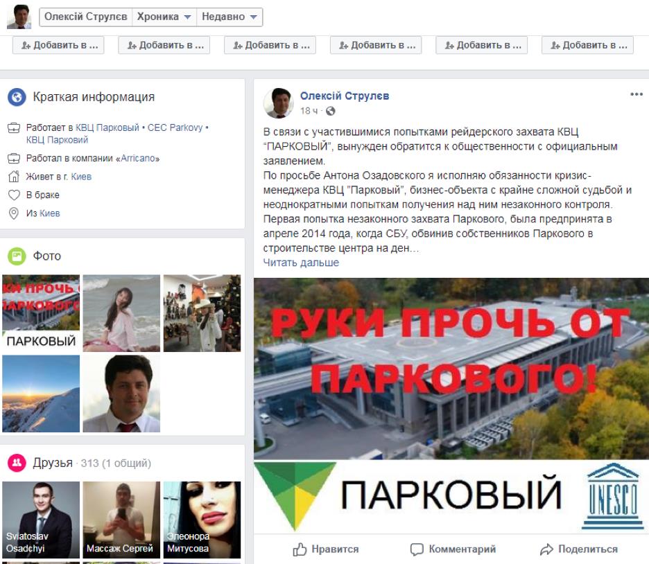 “При этом, Петр Порошенко, видя расправу над Парковым заявил, что он должен быть передан в СОБСТВЕННОСТЬ государства, а НЕ управление! Не могу не отметить, что все попытки захватить Парковый и незаконно поменять собственников начались с приходом новой власти Порошенко!”сообщает Алексей Струлев.