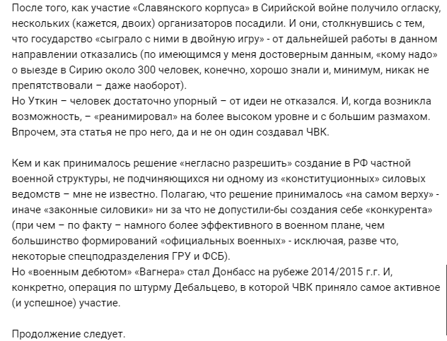 "Но "военным дебютом" "Вагнера" стал Донбасс на рубеже 2014/2015 г.г. И, конкретно, операция по штурму Дебальцево, в которой ЧВК приняло самое активное (и успешное) участие", - уточнил он.