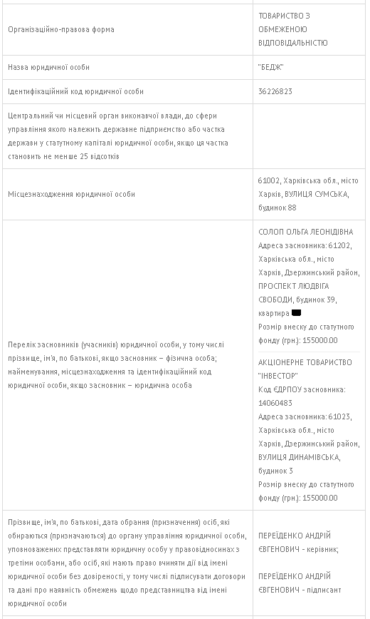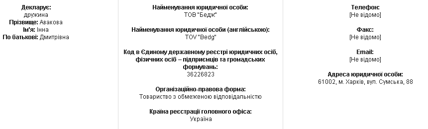 Арсен Аваков указал ООО "Бедж" в своей электронной декларации за 2015 год как юридическое лицо, в котором конечным владельцем (бенефициаром) является его жена Инна Авакова: