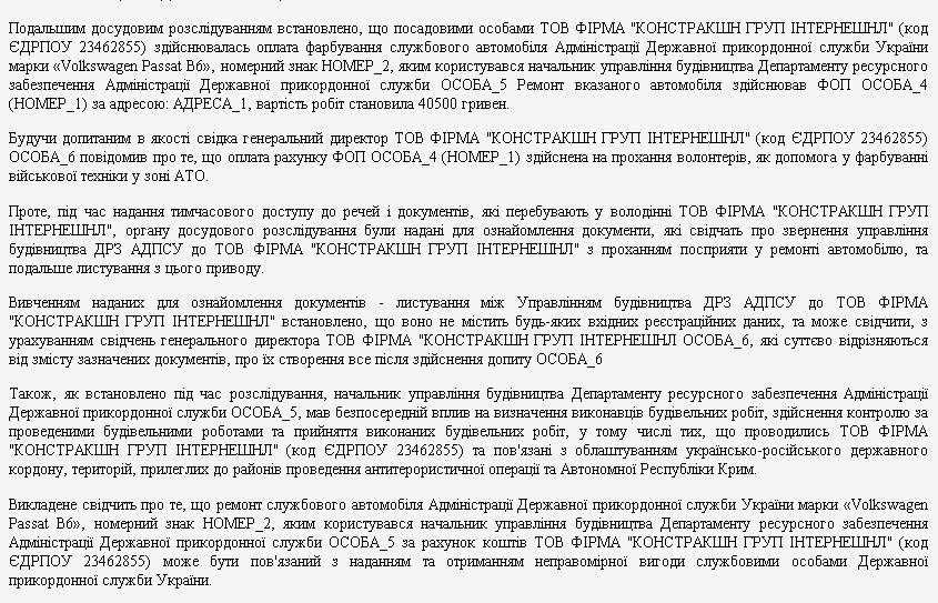 Суть обвинений была изложена в одном из определений Соломенского суда Киева. Согласно этому документу, начальник управления строительства департамента ресурсного обеспечения госпогранслужбы, действуя умышленно, по корыстным мотивам, вопреки интересам службы, в течение марта-мая 2015 вступил с начальником 1-го отдельного отдела капитального строительства погранслужбы в преступный сговор, направленный на завладение средствами госбюджета Украины путем злоупотребления должностными лицами своим служебным положением.