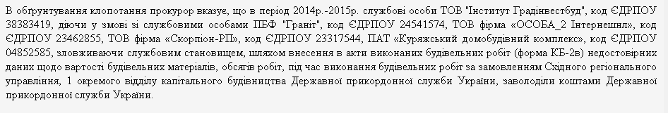 Речь шла о том, что должностные лица 1-го отдела капитального строительства погранслужбы заключили в декабре 2015 года с фирмой "Констракшн групп интернешнл" договор о строительстве опорного пункта на 120 человек на участке "Веселое" Харьковского погранотряда. Сумма договора - 58 миллионов гривен.