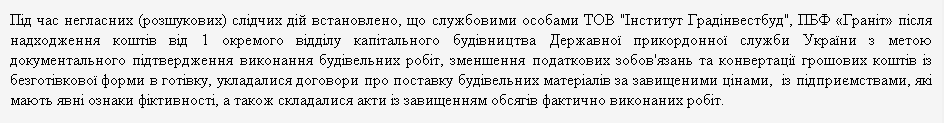 Во время негласных розыскных действий следствие выявило, что две фирмы из этого списка после поступления средств от погранслужбы заключали договоры о поставке строительных материалов по завышенным ценам, с предприятиями, которые имеют явные признаки фиктивности. Также были составлены акты с завышением объемов фактически выполненных работ, проще говоря - с приписками. Делалось это с целью конвертации средств в наличность: