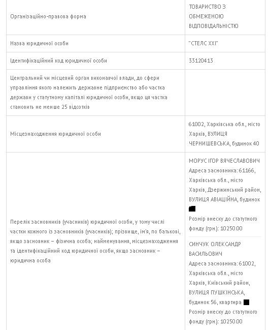 Согласно данным реестра юридических лиц, сейчас единственным учредителем фирмы "Констракшн групп интернешнл" является Игорь Морус. Но раньше вторым соучредителем в фирме был Александр Синчук - сын экс-прокурора Харьковской области Василия Синчука.